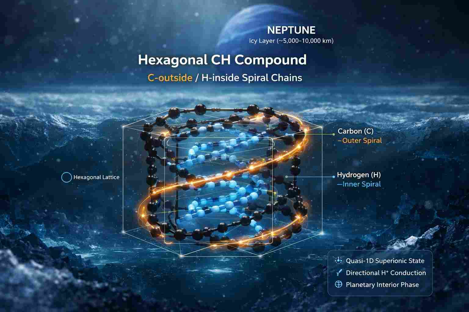 Under extreme planetary conditions, pressures reaching up to 3,000 gigapascals and temperatures of thousands of degrees, atoms reorganize into exotic configurations. In this case, carbon atoms form a rigid lattice while hydrogen atoms flow through it like a fluid, creating what researchers describe as a quasi-one-dimensional superionic state.